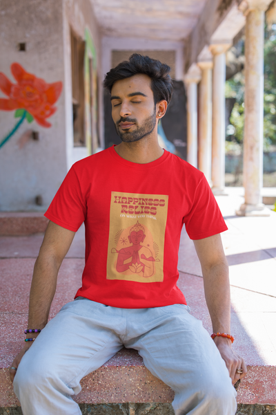 Discover true happiness with the HappinessReliesOnWhatYouThink Crewneck T-Shirt. Show the world what you believe in and join the movement for a brighter future. Comfort and style come together for a lasting impression - wear it proudly and spread the message of joy!
