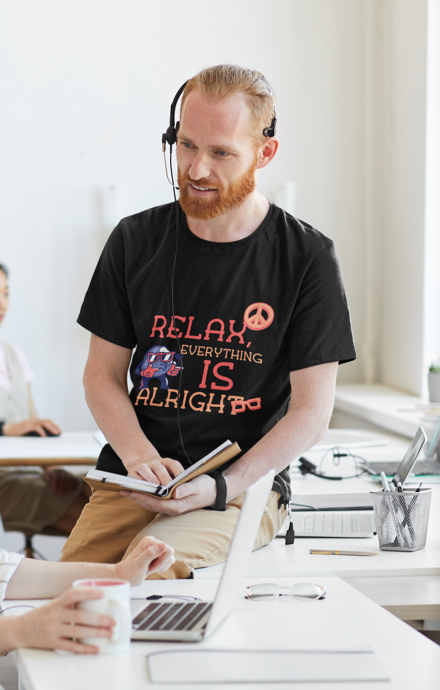 Relax in style with RelaxEverythingIsAlright. Our crewneck t-shirt is designed to help you feel a sense of calm and peace no matter what life throws your way. Perfect for a chill day in, it's easy to wear and comfortable all day long. Ready for a moment of tranquility? RelaxEverythingIsAlright.